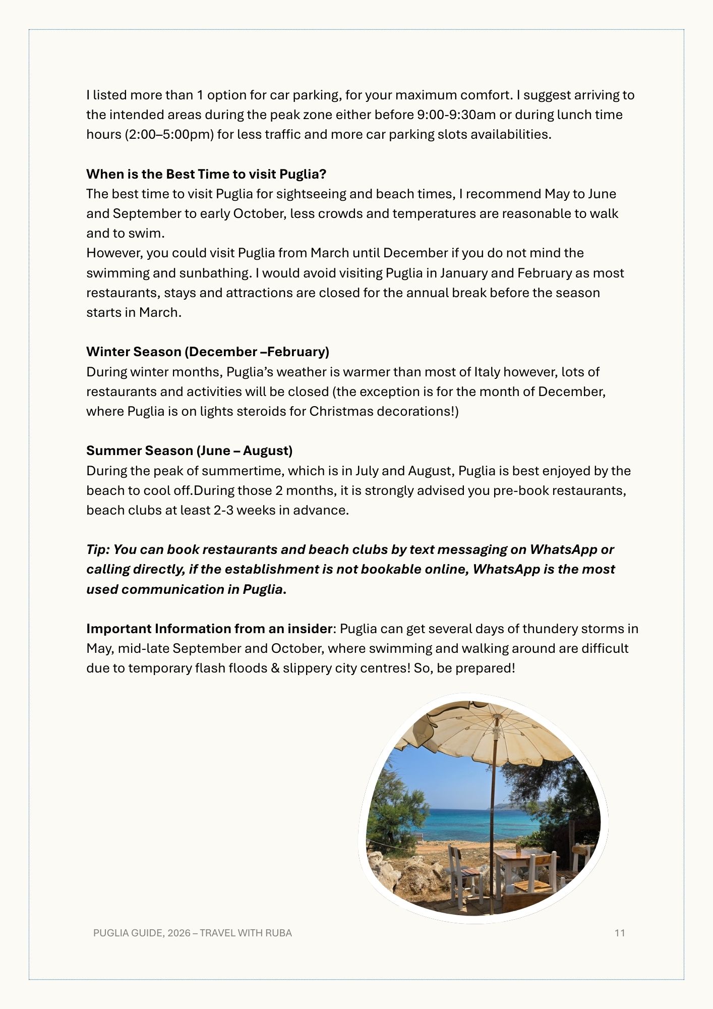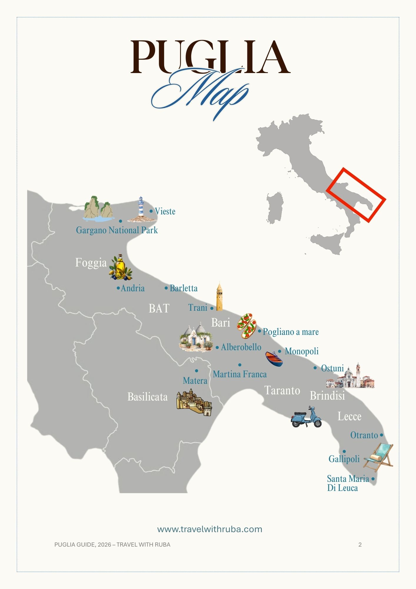 • Puglia top tips from a local, covering (transportation, car parking links, cash vs card, weather, best time to visit each province, time recommended to spend in each province, medical assistance (in case needed) and much more of useful information and tips.