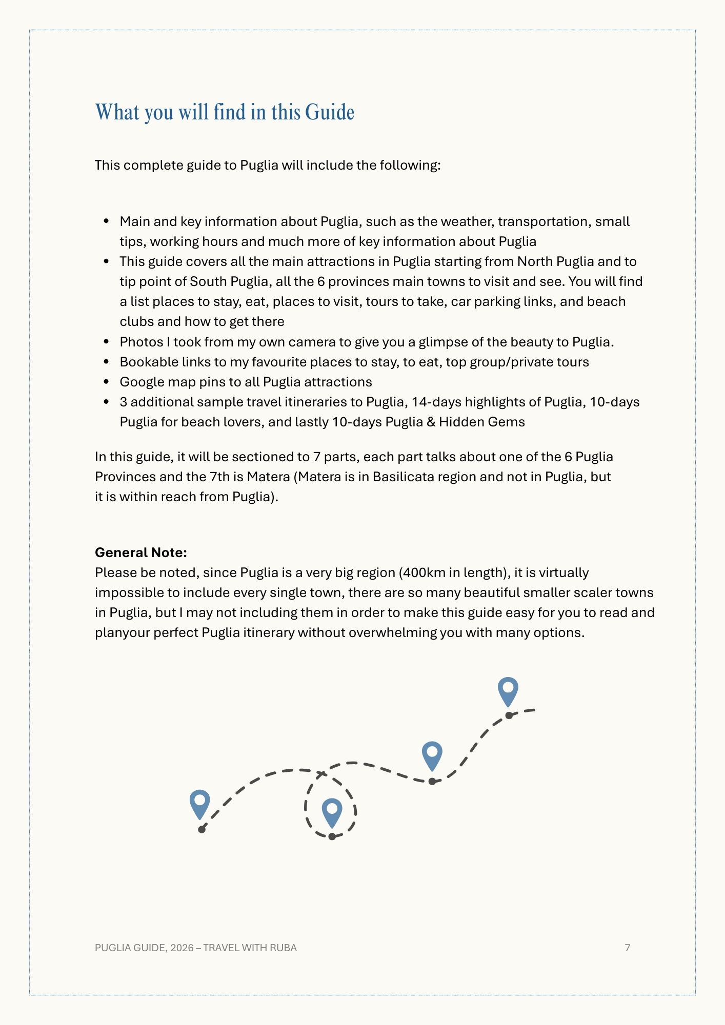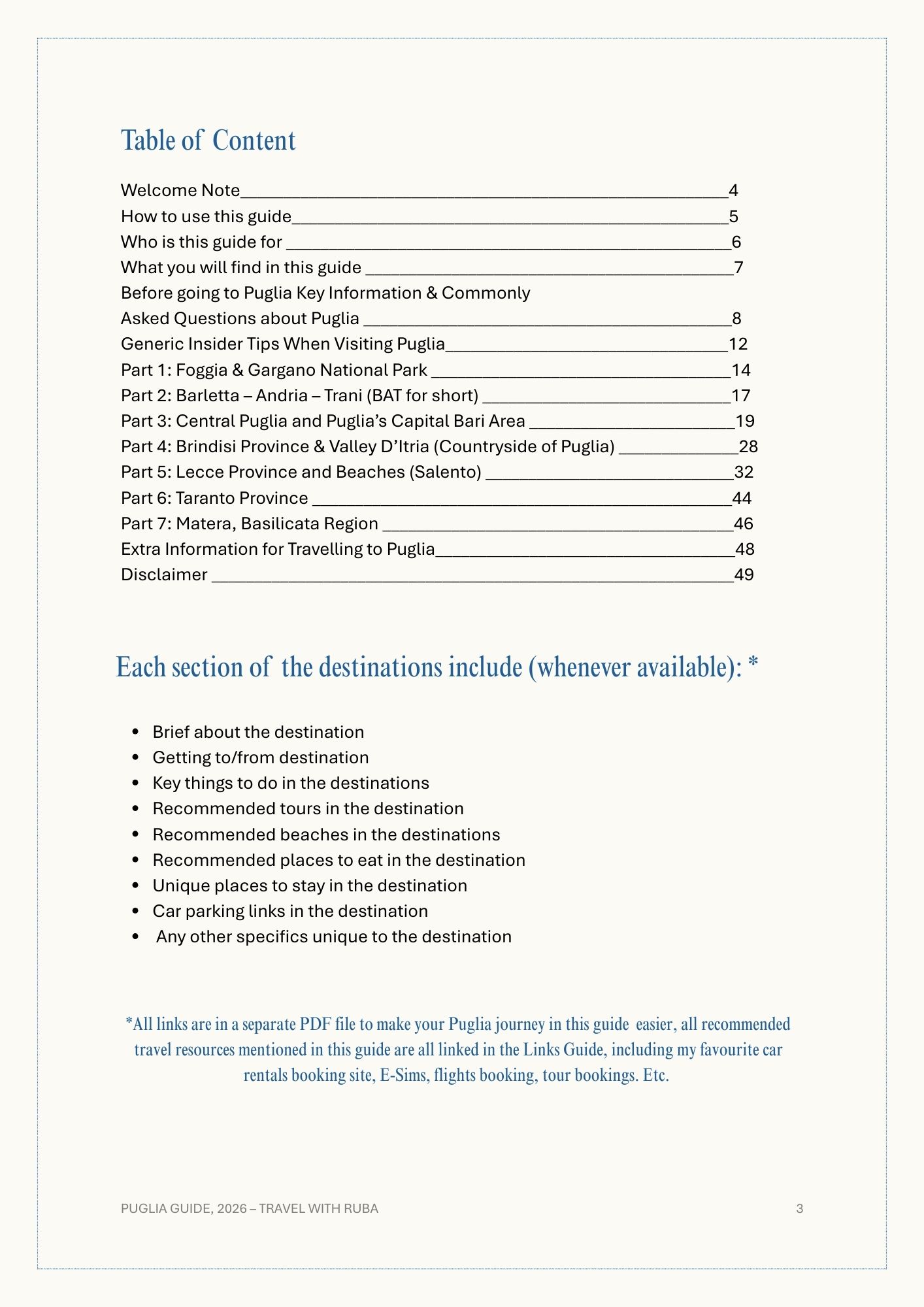• +80 pages of Puglia Links to book directly, this includes (Unique Stays, Top Places to Eat, Trustworthy private/group Tours, Locals Favourite Beaches, Car Parking Google Locations in each City & my Go-To Travelling Resources in Europe)
